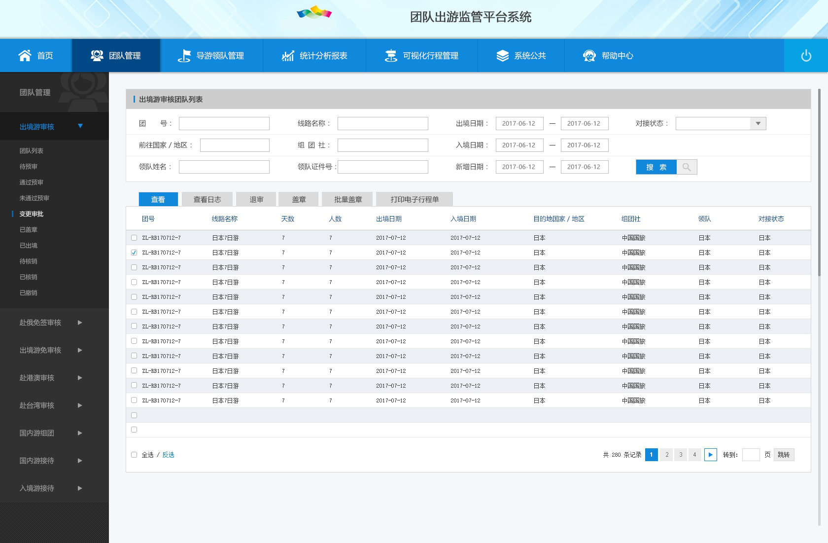 1) 團隊管理:出境游審核、赴俄免簽審核、出境游免簽審核、赴港澳審核、赴臺灣審核、國內游組團、國內游接待、入境游接待。