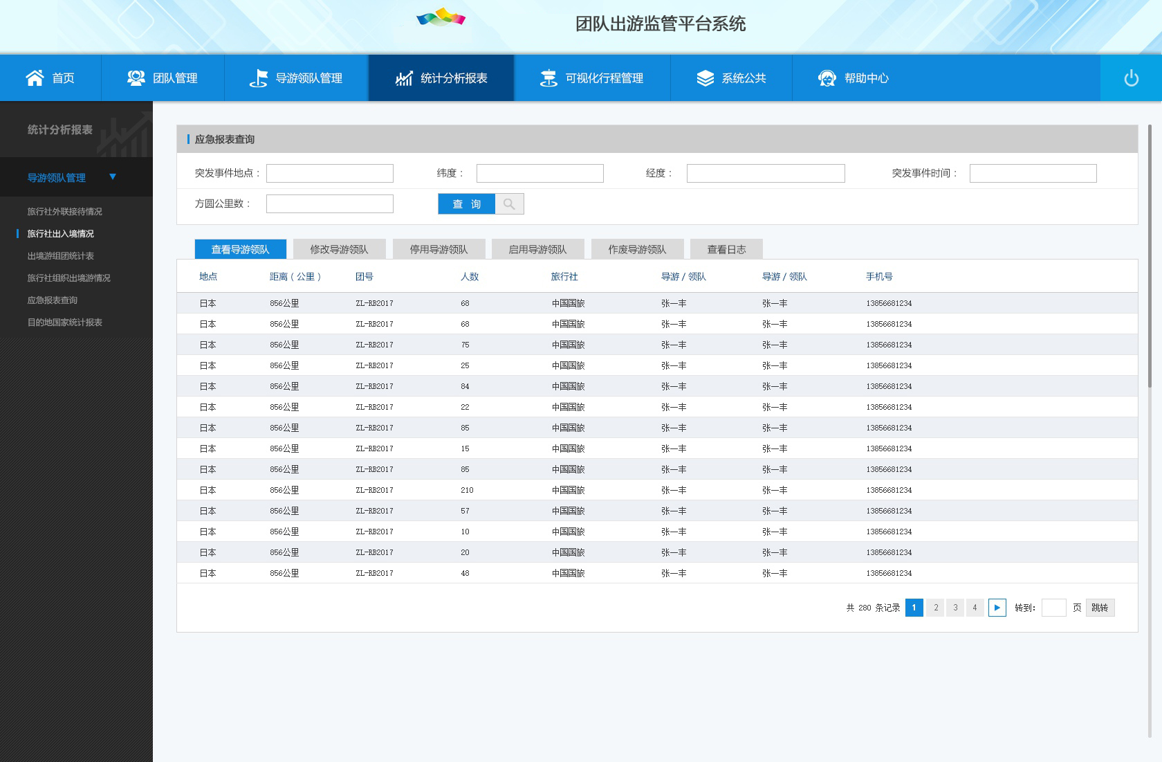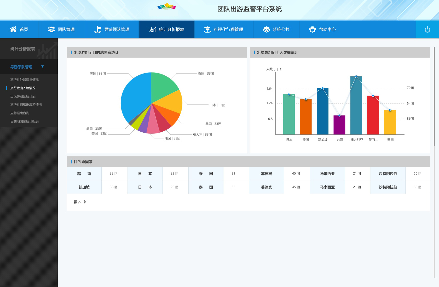 3) 統計分析報表:目的地國家統計表、應急報表查詢、旅行社外聯接待情況、旅行社出入境情況、出境游組團統計表。