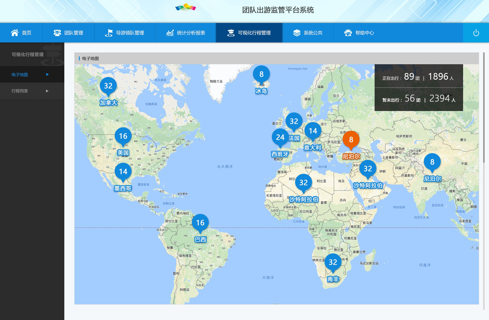 團隊出境旅游監測與分析對接國家旅游團隊管理系統數據,通過對旅游團電子行程單和旅游合同數據的接入,實現對出境旅游團隊監測監管,方便在發生旅游突發事件時迅速開展救援、服務工作。