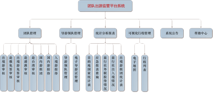 根據團隊出游業務需求及出境旅游行業特點,出境旅游團隊監測與分析功能包括團隊管理、導游/領隊管理、統計分析報表、可視化行程管理和系統公告、幫助中心六大部分。