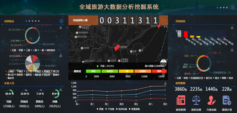 對全縣的旅游目的地資源數據、旅游投訴數據、游客屬性數據、客流量、旅游團隊等數據進行分析展示。