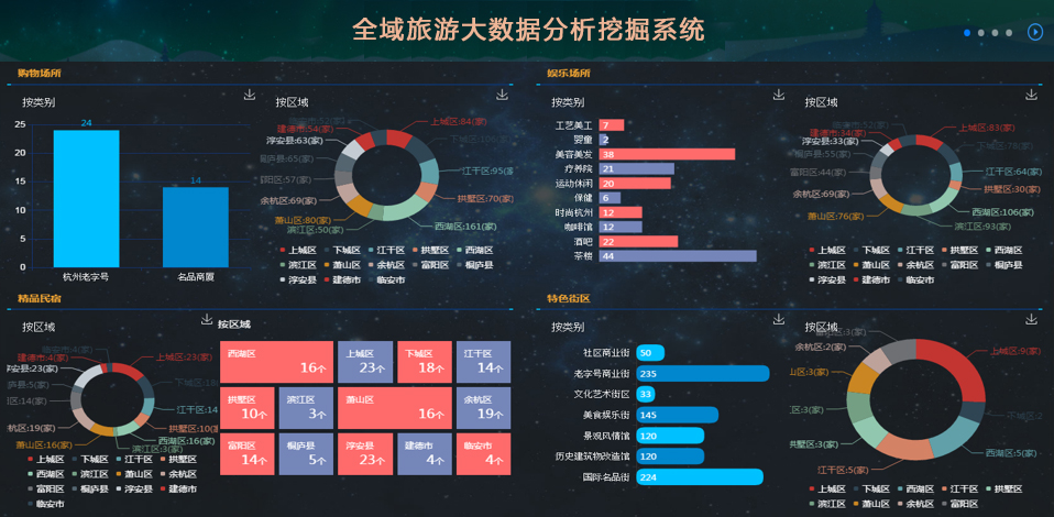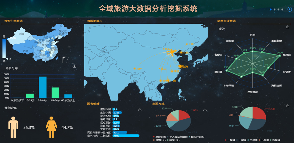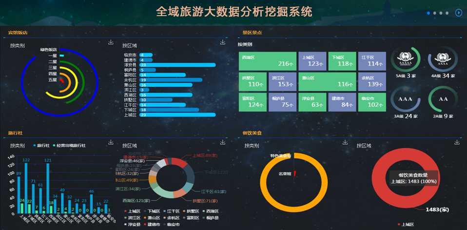 旅游產業分析需對吃住行游購娛六類旅游要素的數據進行分析,并通過圖形圖表的方式進行展示。