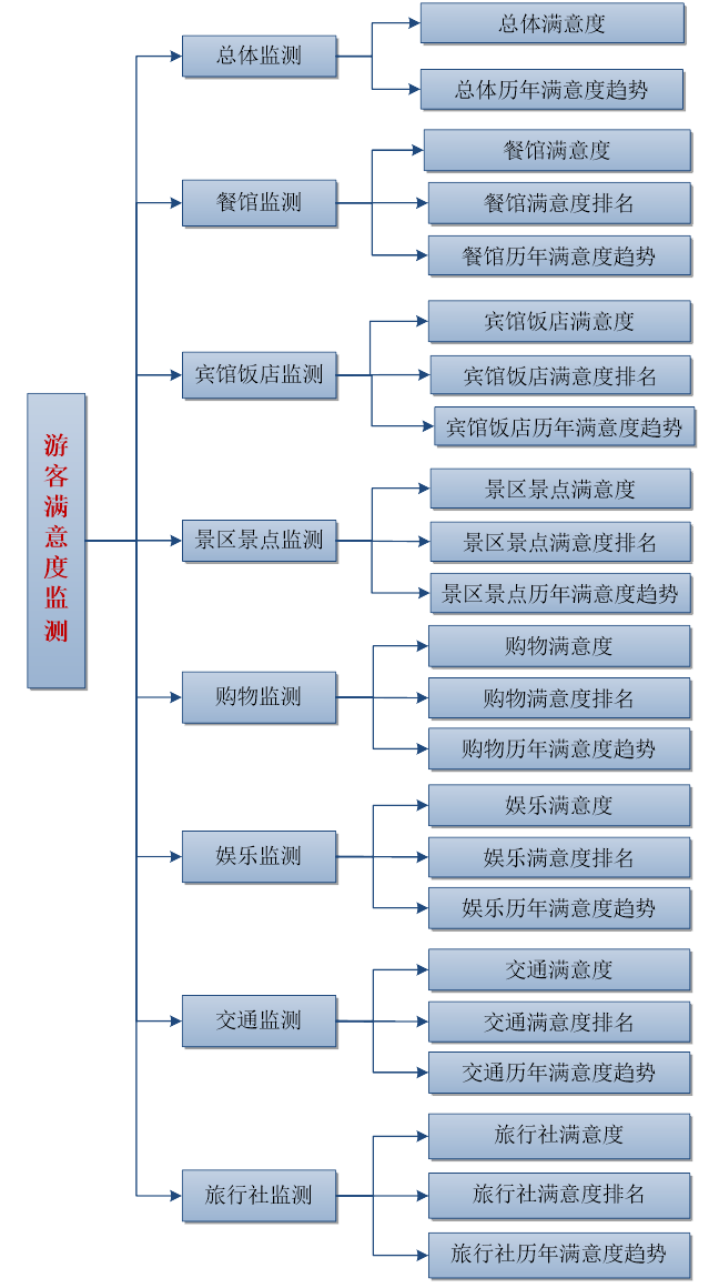 ● 總體監(jiān)測:監(jiān)測當(dāng)前游客對旅游行業(yè)的總體滿意度,并分析歷年總體滿意度的發(fā)展趨勢;