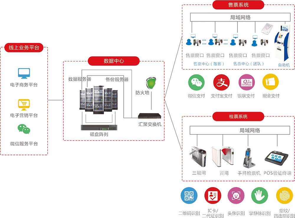 包含線下電子票務系統,線上分銷平臺、電子商務平臺、微信服務平臺等,通過線上業務系統進行產品預訂,數據同步匯總至數據中心,線下系統進行取票、驗證,實現了線上、線下一體化的功能,售票支持微信、支付寶、銀聯、現金等支付模式,驗票支持二維碼、IC卡/二代證、頭像識別、掌靜脈、四連指等識別模塊,功能結構圖如下: