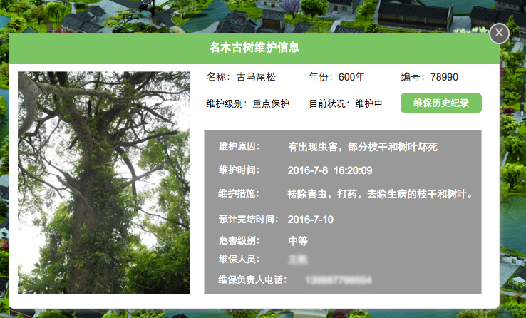 結(jié)合GIS地圖,實(shí)時(shí)展示每一個(gè)設(shè)備的正在維保維修中的信息,維保人員根據(jù)維保任務(wù)計(jì)劃周期時(shí)間,定時(shí)為景區(qū)設(shè)施設(shè)備進(jìn)行巡檢和維護(hù)。同時(shí)也能查看每一個(gè)設(shè)備的維保歷史記錄,以及正在維保的狀態(tài)跟蹤。