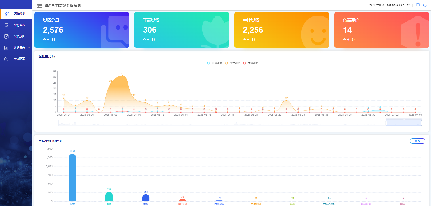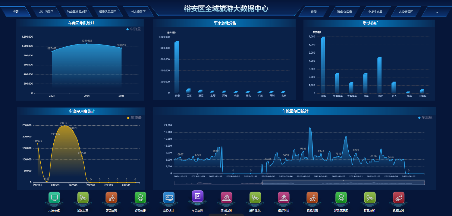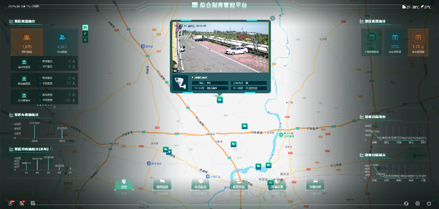 主要功能包含:旅游產業運行狀態監測、旅游產業運行態勢分析和旅游產業運行預警、景區運營分析、客流態勢分析、游客畫像分析、票務統計分析、車流態勢分析、輿情監測分析、投訴統計分析等。