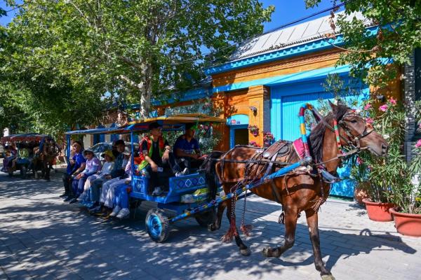 清晨的陽(yáng)光灑在喀贊其老街的藍(lán)色門(mén)窗上,馬蹄聲踏破了巷道的寧?kù)o。一輛盛裝的“馬的”載著游客緩緩而行,車(chē)夫哼著維吾爾小調(diào),鈴聲叮咚間,百年老墻上的雕花在光影里蘇醒。轉(zhuǎn)角處,幾個(gè)孩子追逐著鴿群跑過(guò)彩繪墻,游客的鏡頭捕捉下這抹斑斕——這不是精心設(shè)計(jì)的景區(qū)表演,而是伊寧老城最真實(shí)的日常圖景。