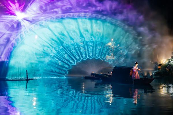 揚州古運河畔,全國首個全景式大型沉浸演藝“大運揚州”正在上演。游客乘船行進中,五大歷史篇章通過聲、光、電、水、火、投影、機械、飛行器及伴行船等十余種手段次第展開。3D Mapping秀將千年運河史投射于真實水岸,游客仿佛穿越至隋唐漕運的繁忙場景。而僅一街之隔的東關(guān)街上,《創(chuàng)世山海經(jīng)》數(shù)字藝術(shù)展正引發(fā)新熱潮——AR技術(shù)掃描書頁,明代彩繪本中的神獸便“破卷而出”,九尾狐踏月而行,饕餮自巖壁躍出,配合5.1環(huán)繞聲效與地面互動投影,打造“人在畫中游”的奇幻世界。