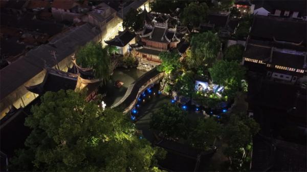 踏入豫園2號門,仿佛按下“次元穿梭鍵”,百年亭臺樓閣在光影交錯間化身國創宇宙,游客在九曲橋的漣漪里看見《百妖譜》桃夭的倒影,在明代演武場舊址聽到《鎮魂街》的熱血宣言。凝暉路的千盞燈籠暈染出《天官賜福》極樂坊的暖光,湖心亭的檐角輪廓在3D mapping投影中時隱時現。