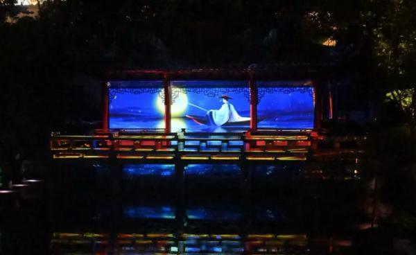 在九曲橋廣場,“湖心溢彩幻影秀”運用三維聲樂影像投影技術,將百年湖心亭作為動態畫布,演繹夢幻江南故事。中心廣場的“萌獸出沒寶藏屏”上,裸眼3D熊貓與青翠竹筍互動嬉戲,瞬間將明清廣場變為竹林環抱的奇幻世界。