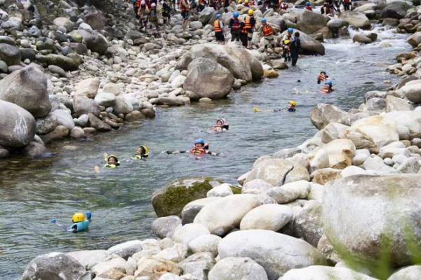 在廣西桂林貓兒山景區,一種被稱為“窩囊漂”的旅游項目人氣頗旺。這一項目區別于傳統主打驚險刺激的漂流,以慢節奏、松弛感為調性,游客可以臥躺在水面,享受漂流樂趣。