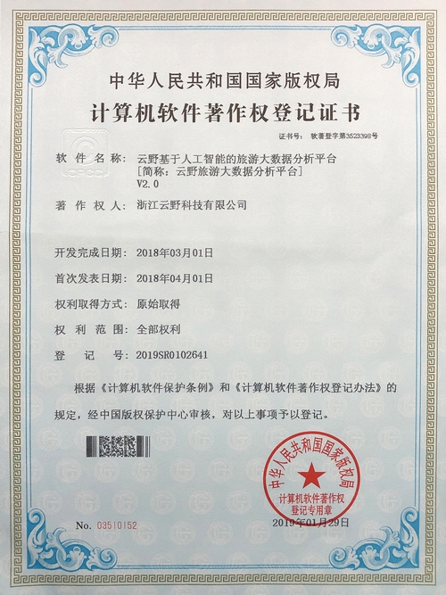 《云野基于人工智能的旅游大數據分析平臺V2.0》于2019年1月29日被正式授予《中華人民共和國國家版權局計算機軟件著作權登記證書》,登記號為2019SR0102641。