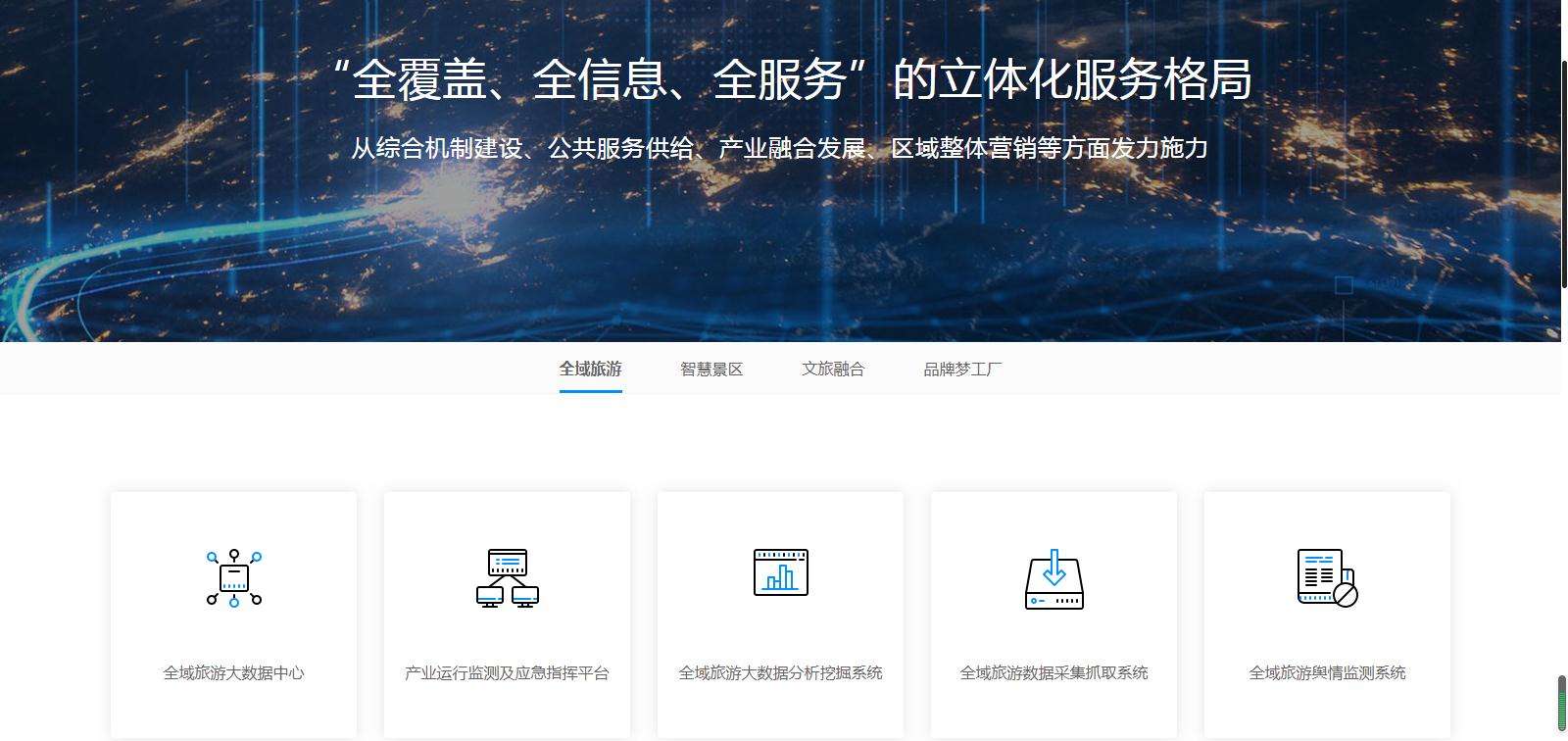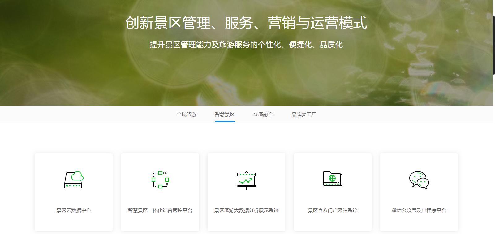 該產(chǎn)品模塊主要分為全域旅游、智慧景區(qū)、文旅融合、品牌夢(mèng)工廠四大模塊,從硬件軟件到系統(tǒng)開發(fā),從文案策劃到設(shè)計(jì)創(chuàng)新,所有產(chǎn)品一應(yīng)俱全,分類清晰,方便客戶針對(duì)自身需求尋找對(duì)應(yīng)的產(chǎn)品。