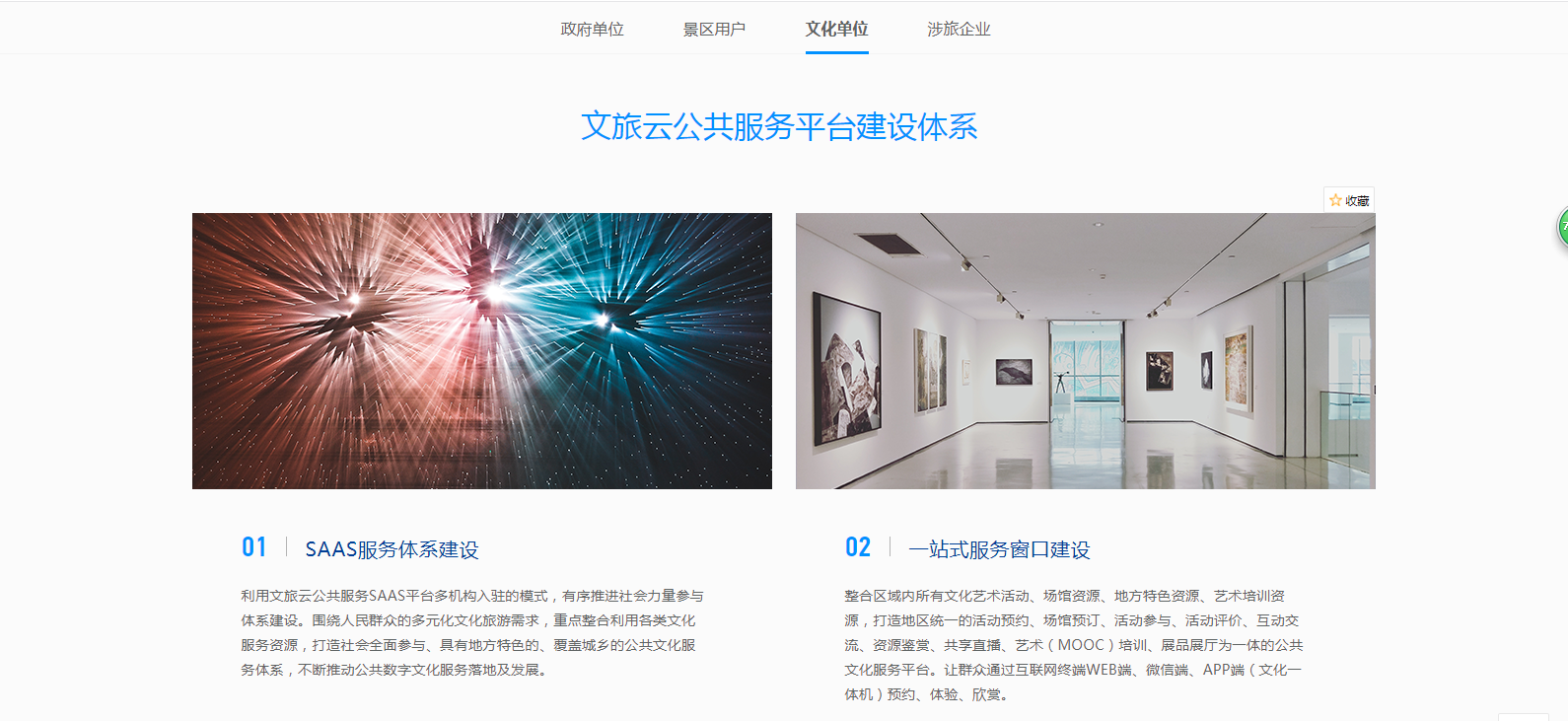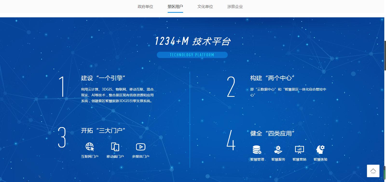 針對(duì)不同用戶屬性,分為政府單位、景區(qū)用戶、文化單位、涉旅企業(yè)。為不同行業(yè)客戶及合作伙伴,提供更為詳盡的方案支持,如政府單位的全域旅游“121工程”、景區(qū)用戶的“1234 M”技術(shù)、文化單位的服務(wù)平臺(tái)建設(shè)體系、涉旅企業(yè)的電子商務(wù)系統(tǒng)和活動(dòng)營銷平臺(tái)。